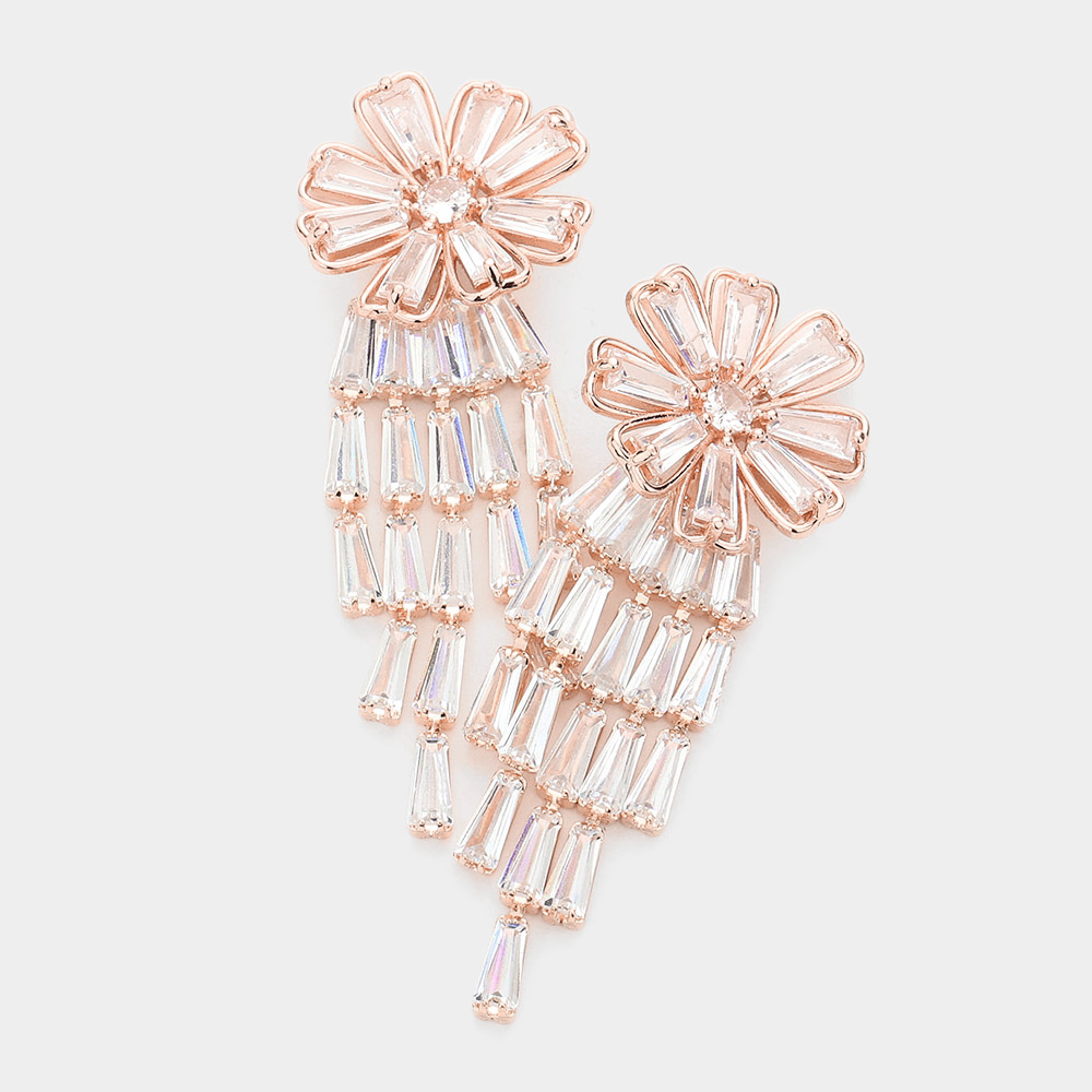 Flower Accented Irregular Rectangle Stone Link Dangle Earrings