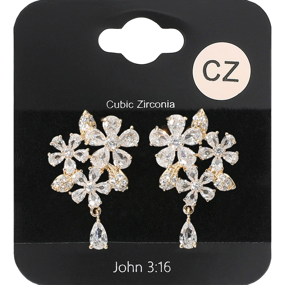 Flower CZ Stone Cluster Embellished Teardrop Dangle Evening Earrings