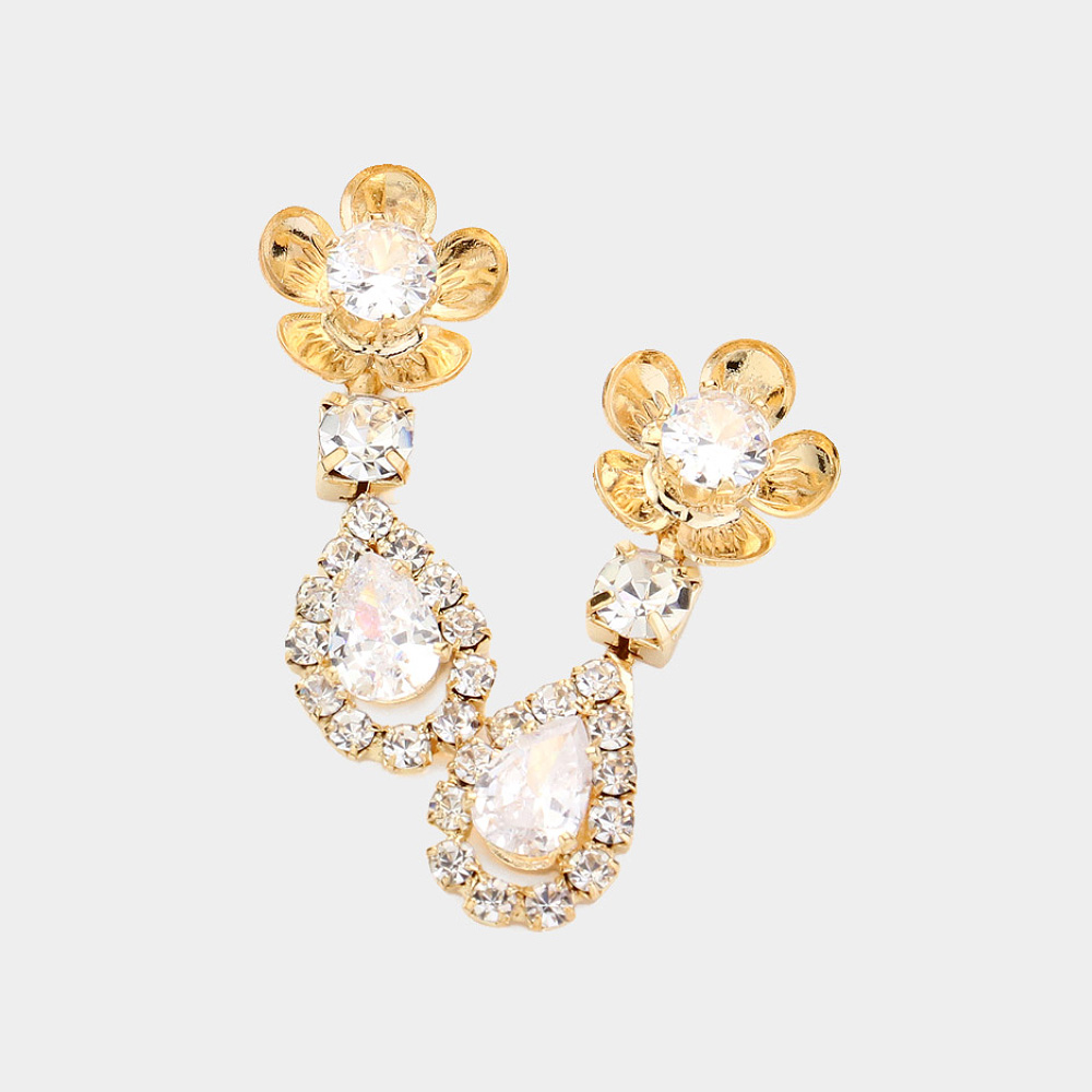 Flower CZ Stone Pointed Teardrop Dangle Evening Earrings