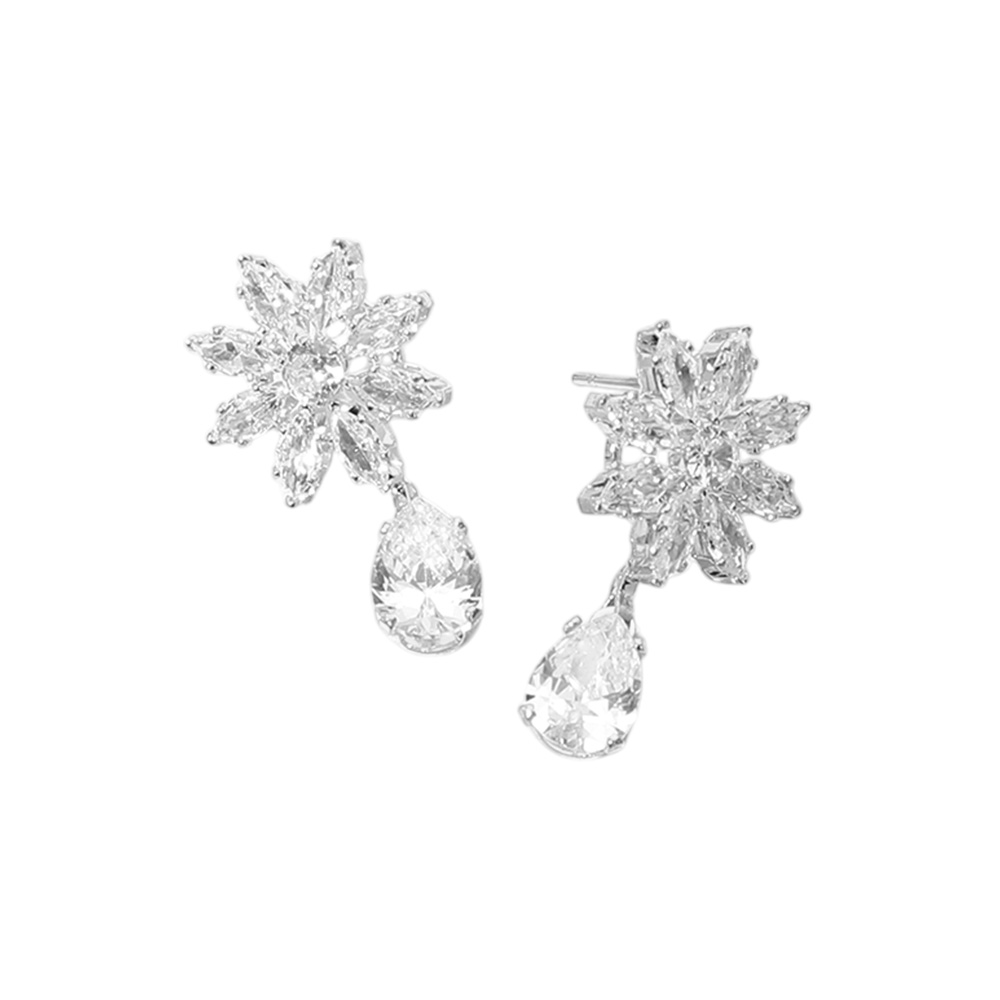 Details • Size : 0.75" X 1.25" • Post Back • Chic floral starburst earrings featuring a radiant cluster top with a dangling teardrop charm. The layered geometric petals create an elegant sparkle, ideal for weddings, parties, and refined evening looks. • Lead and Nickel Compliant • CZ Cubic Zirconia