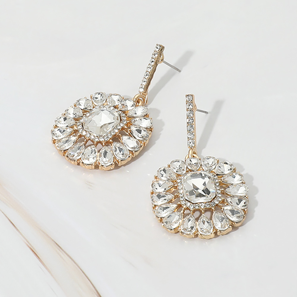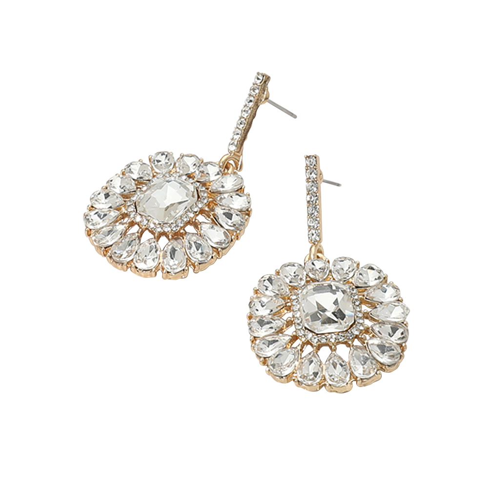 Details • Size : 1" X 1.8" • Post Back • Make a statement with round crystal drop earrings featuring intricate gemstone detailing. Perfect for parties, weddings, or adding glamour to any evening outfit. Lightweight and eye-catching design. • Lead and Nickel Compliant