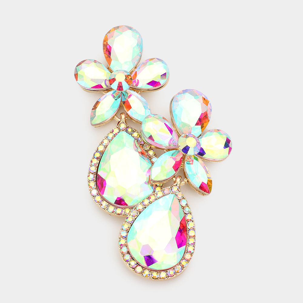Flower Stone Embellished Teardrop Stone Dangle Evening Earrings