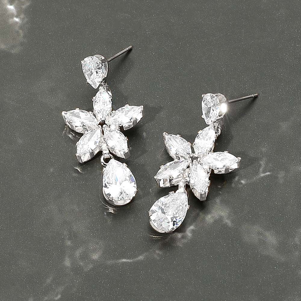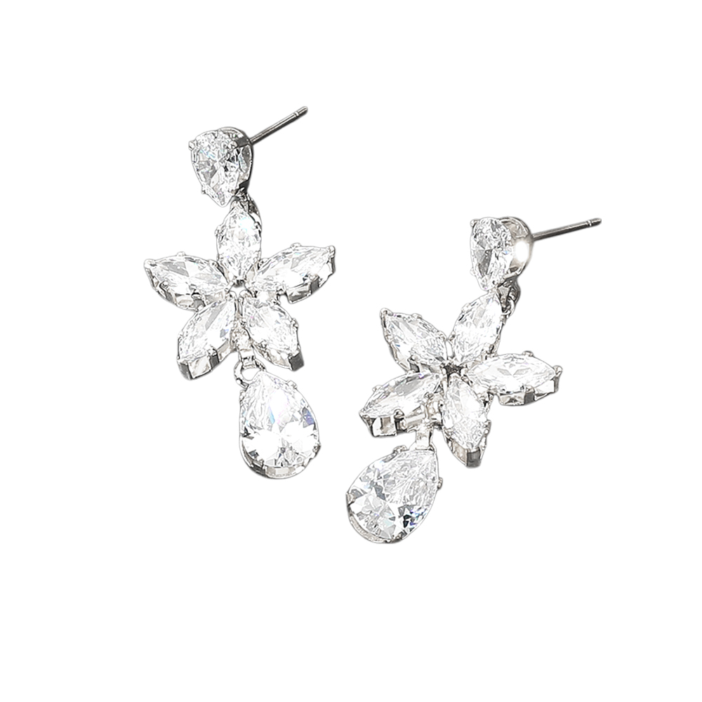 Flower Teardrop CZ Stone Drop Dangle Evening Earrings