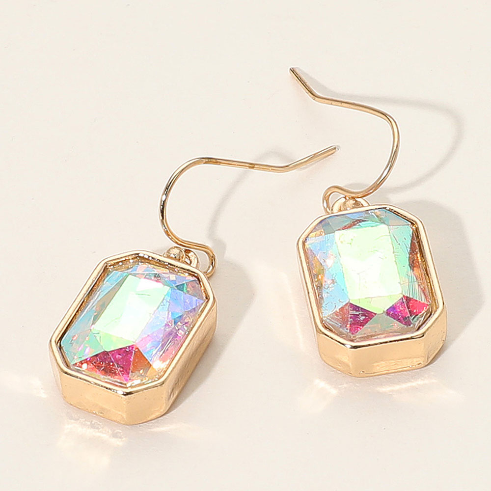 • Add sparkle to your look with these faceted iridescent drop earrings. Featuring a sleek geometric design and eye-catching shine, they bring a glamorous touch to evening wear or everyday outfits.
