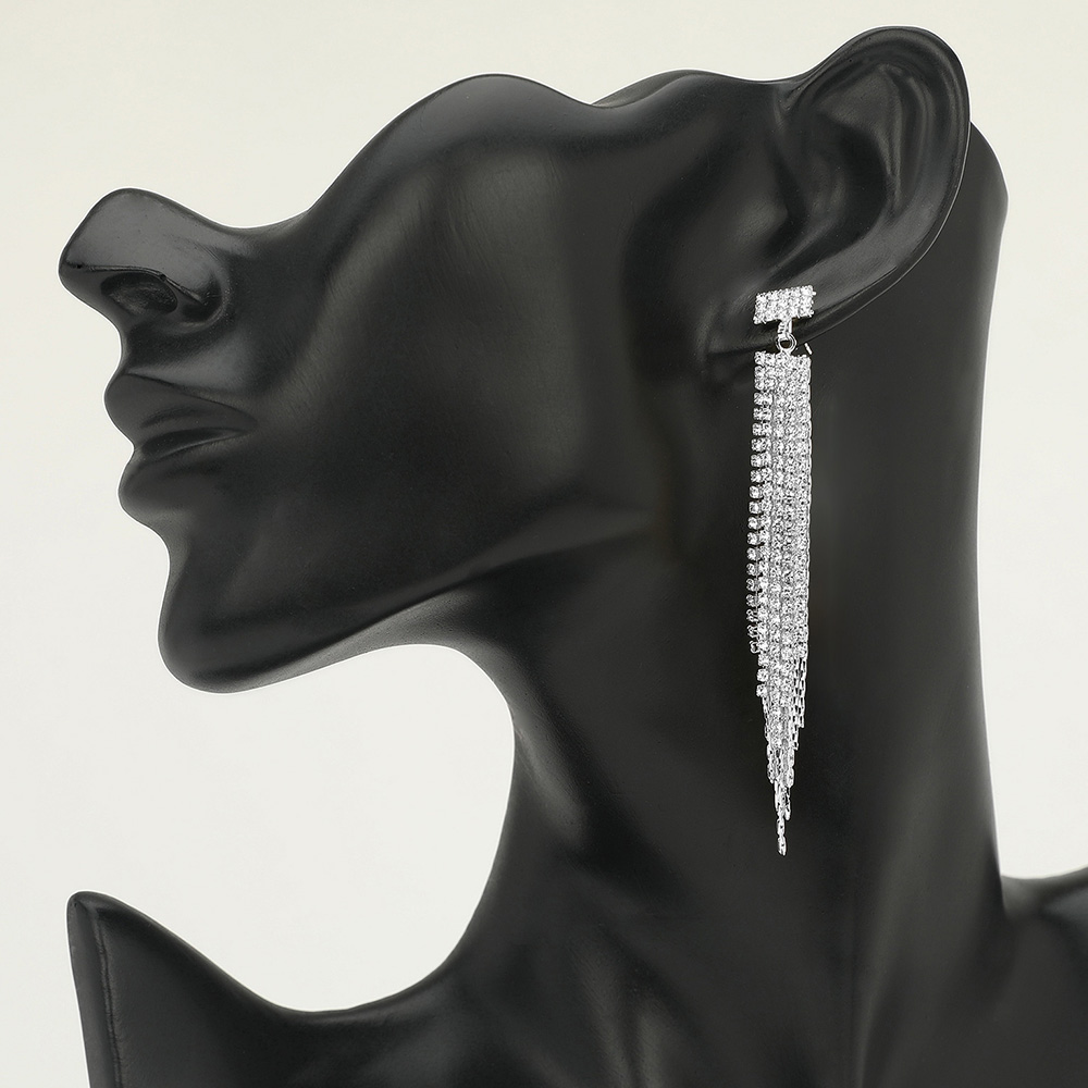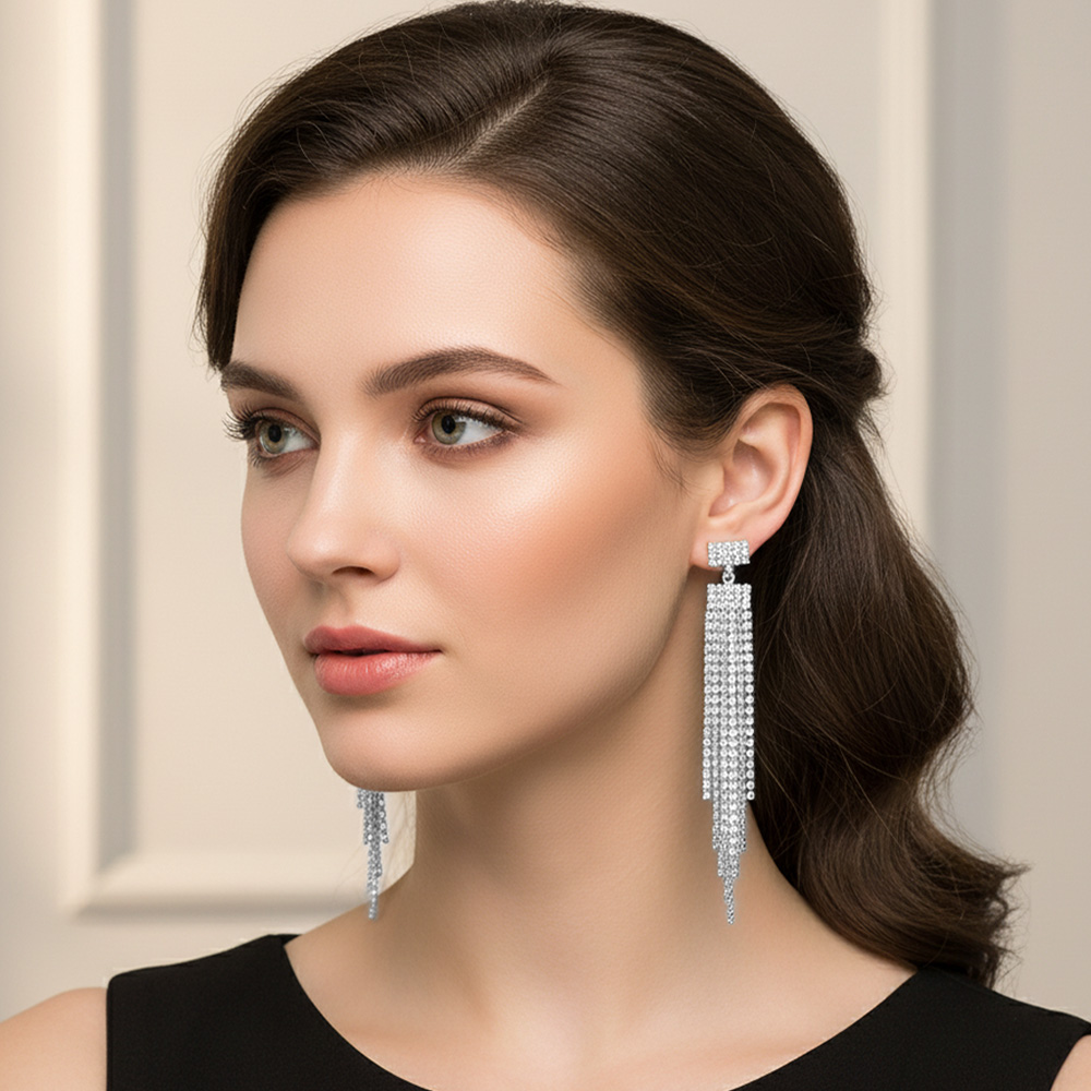• Long rhinestone tassel dangle earrings with cascading strands for a sleek, elegant finish. Perfect for evening wear, weddings, and parties, these sparkling earrings add drama and sophistication to any outfit.