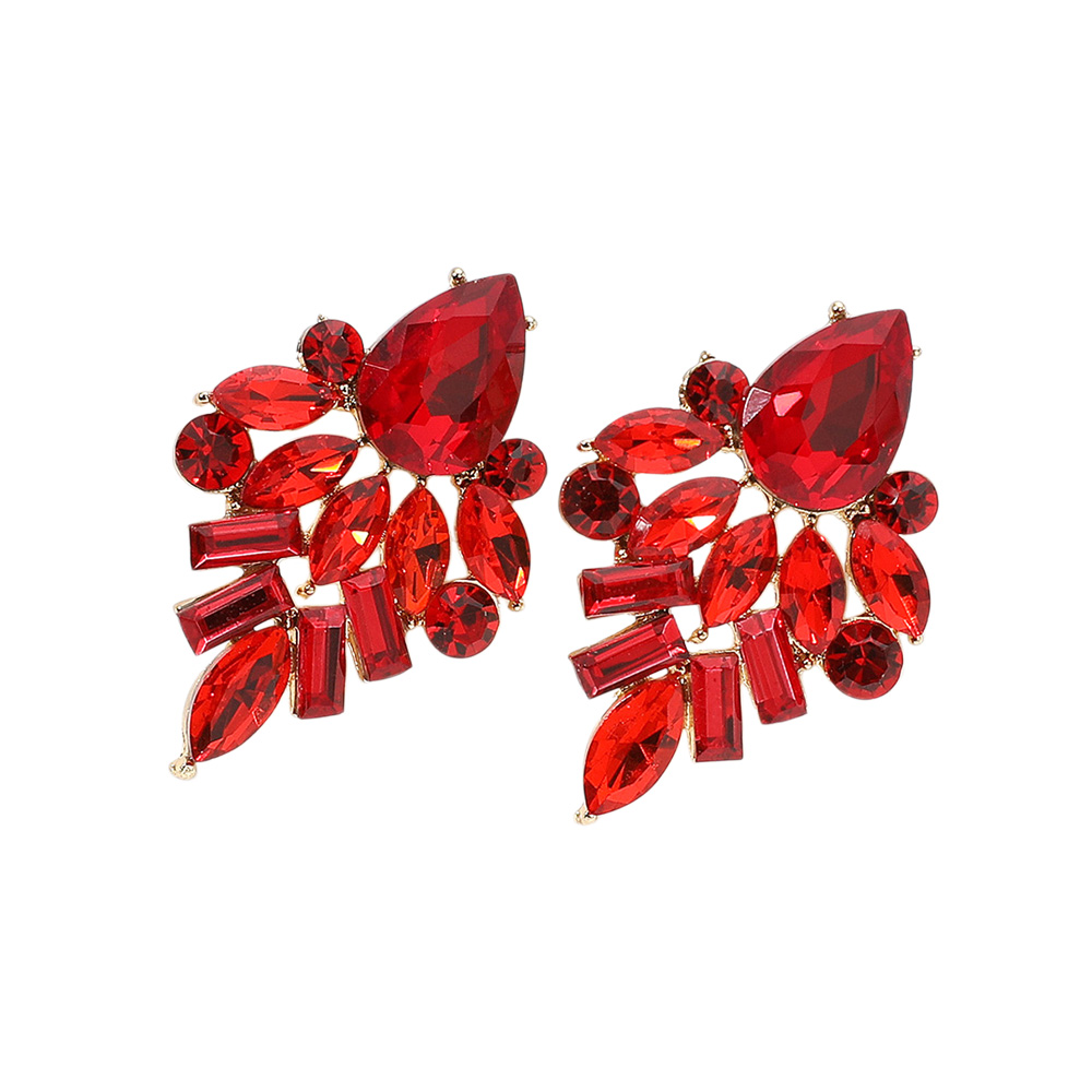 Details • Size : 1" X 1.4" • Post Back • Shine brilliantly with these radiant cluster stud earrings, designed with an array of faceted crystals in teardrop, oval, and baguette cuts. Their intricate arrangement adds a touch of glamour, making them the perfect accessory for special occasions or elevating your everyday chic look. • Lead and Nickel Compliant