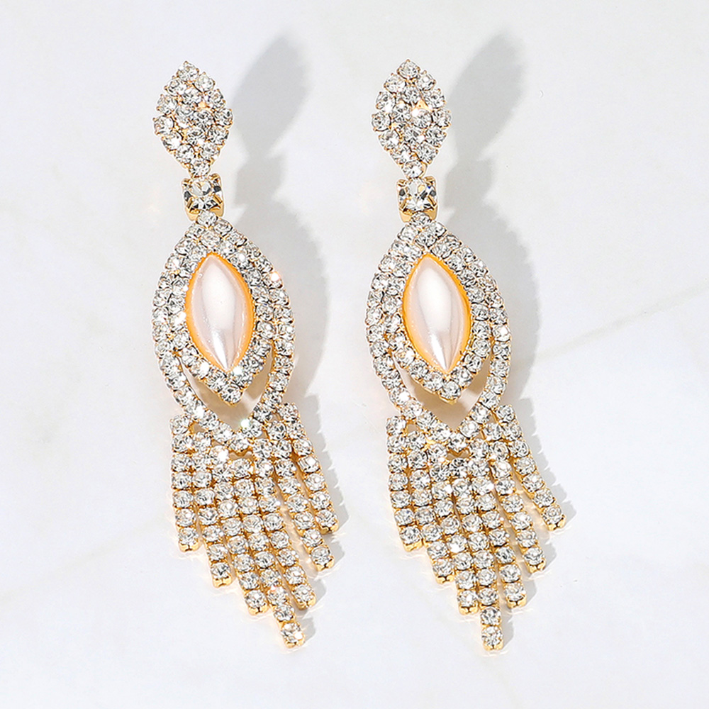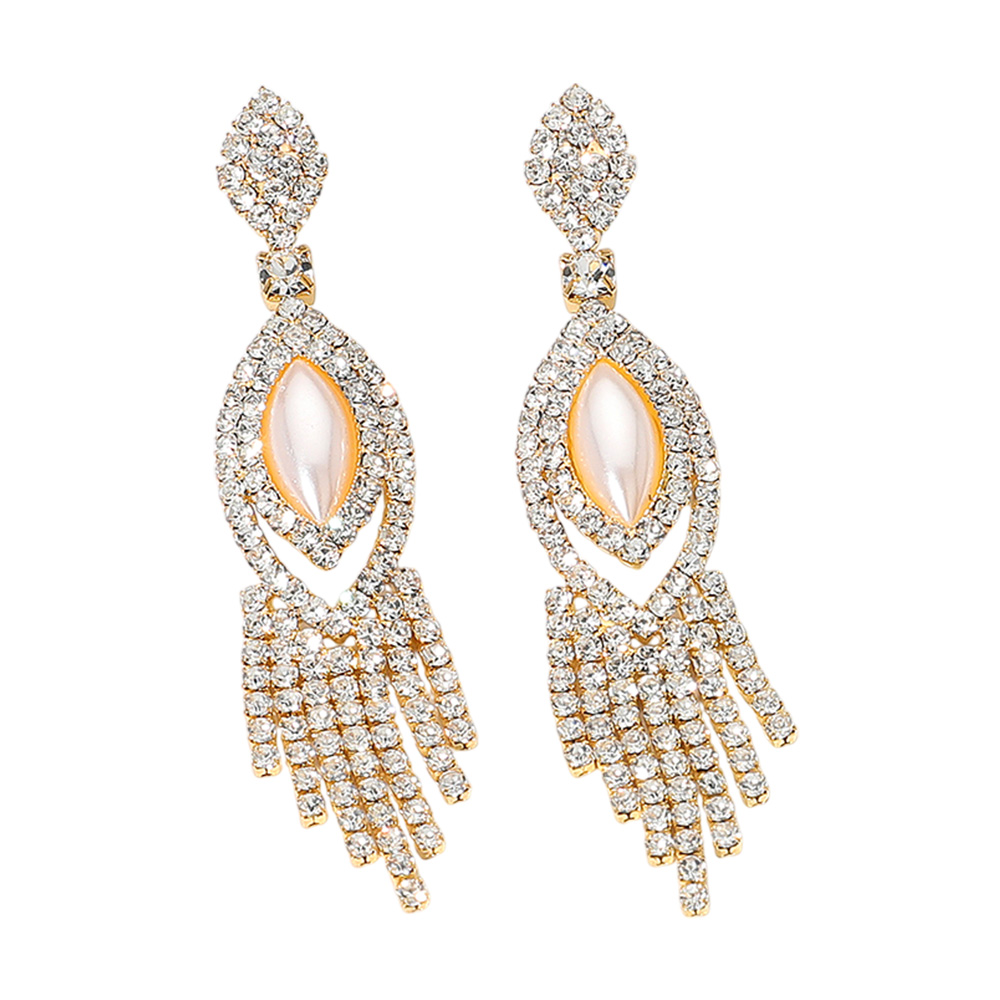 Marquise Pearl Pointed Rhinestone Paved Fringe Dangle Earrings