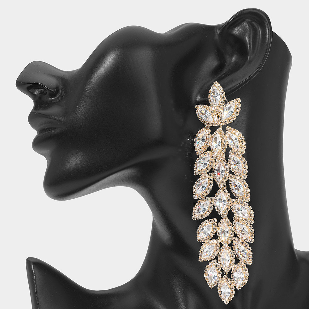 • Dramatic marquise crystal statement earrings with cascading leaf design. Perfect for weddings, formals, or upscale events. Lightweight yet bold, these earrings add instant glamour. A must-have for boutique collections seeking high-impact accessories that sparkle.