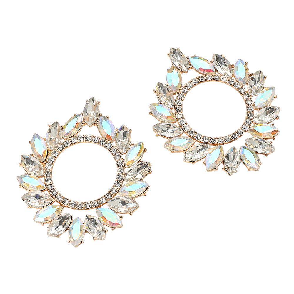 Details • Size : 1.75" X 2.1" • Post Back • Radiant earrings showcasing marquise-cut crystals arranged in a striking sunburst design around a sparkling open circle center. Perfect for elevating evening wear or special event outfits, these earrings blend timeless elegance with bold, eye-catching style for a glamorous finish. • Lead and Nickel Compliant