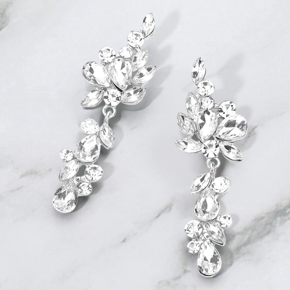 • These dazzling crystal leaf drop earrings feature a cascading design that shimmers beautifully with every movement. Perfect for special occasions or evening wear, they offer a radiant sparkle and graceful silhouette that elevate any outfit with timeless elegance and sophistication.