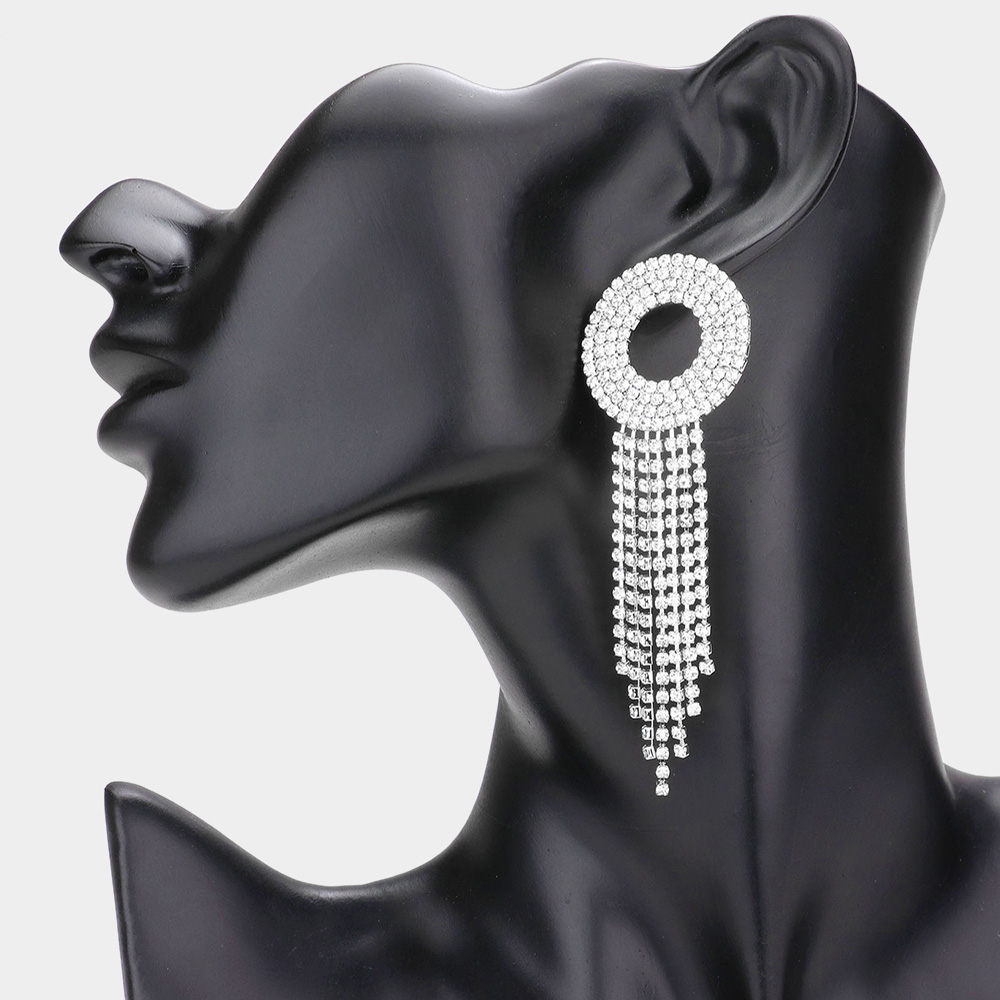 Open Circle Accented Rhinestone Fringe Dangle Evening Earrings