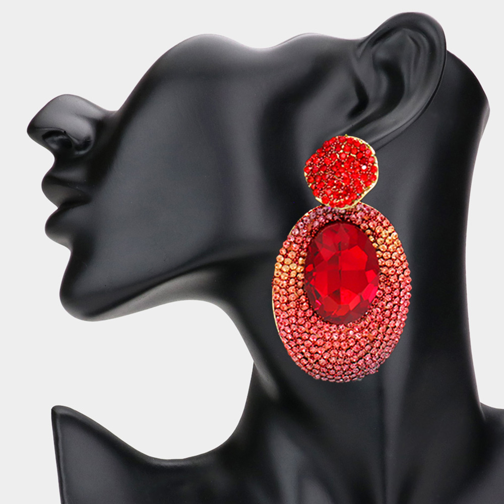 Oval Glass Stone Pointed Rhinestone Paved Dangle Evening Earrings