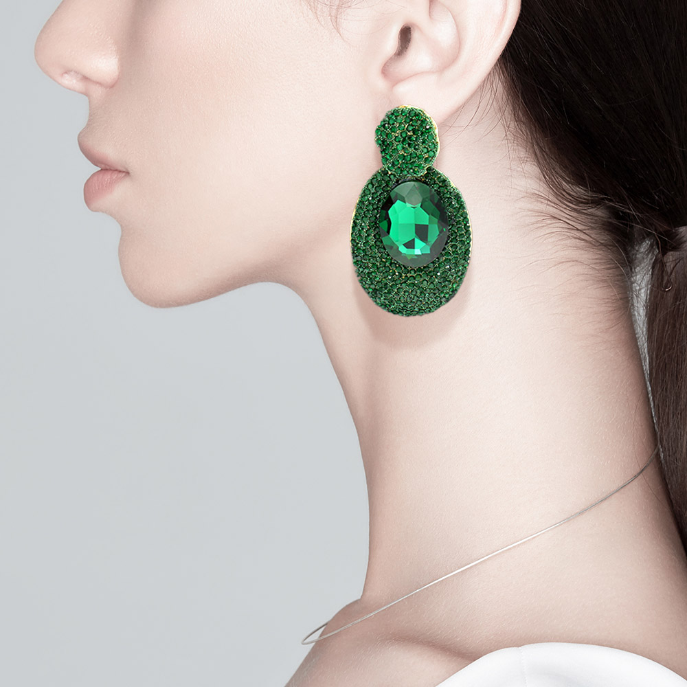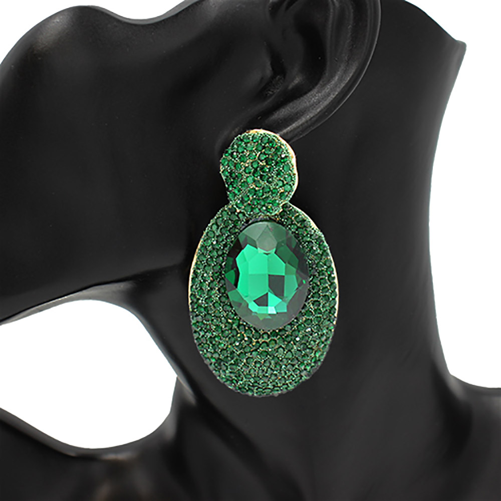 Oval Glass Stone Pointed Rhinestone Paved Dangle Evening Earrings