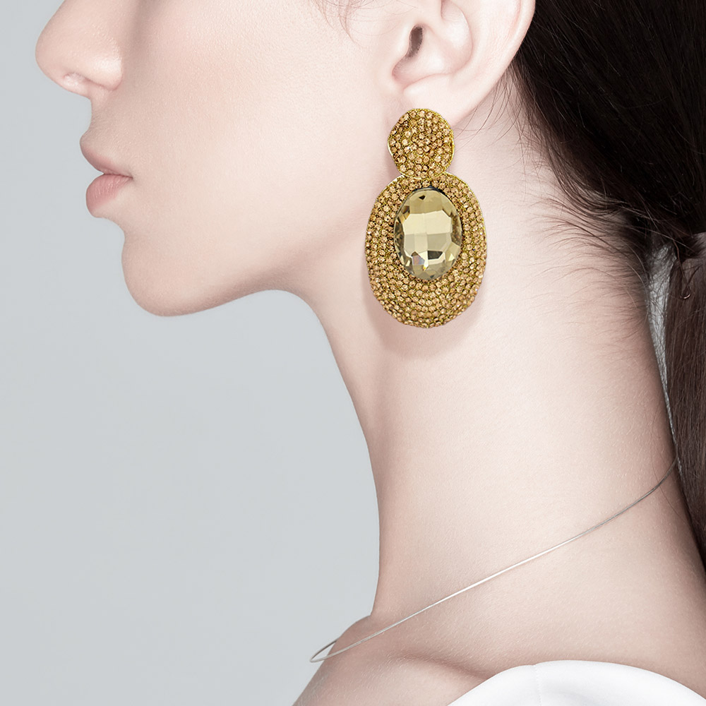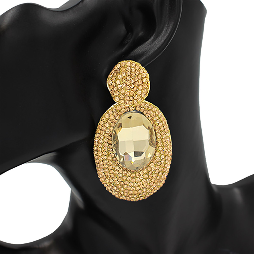 Oval Glass Stone Pointed Rhinestone Paved Dangle Evening Earrings