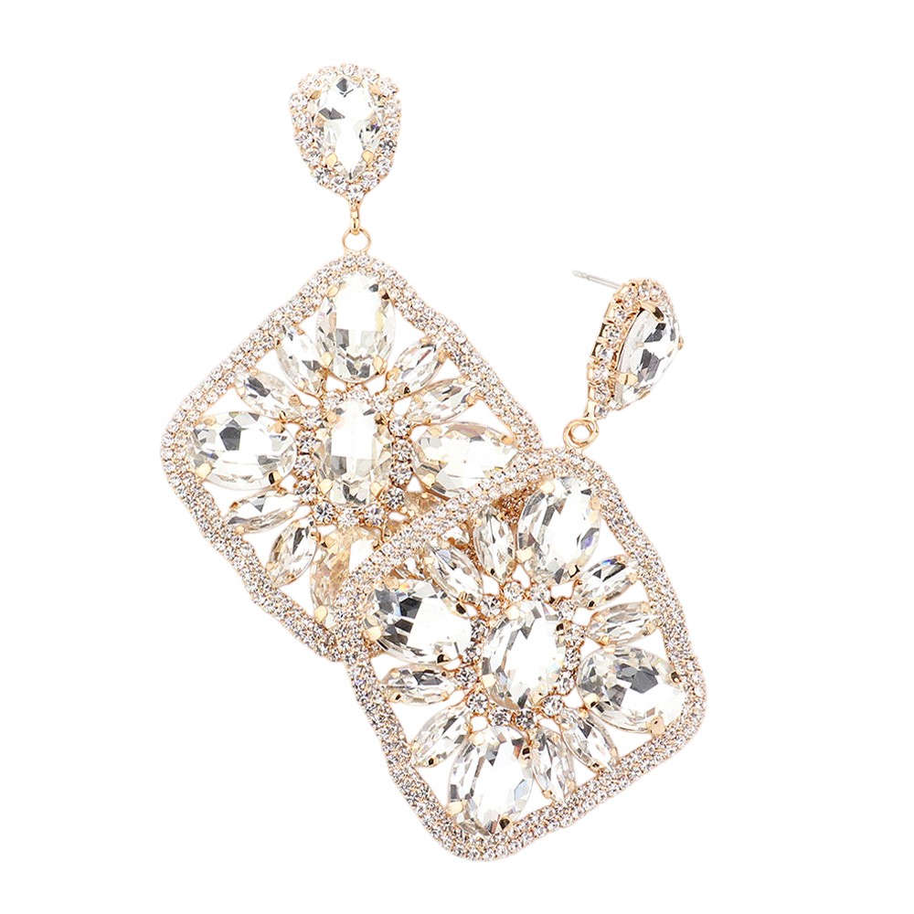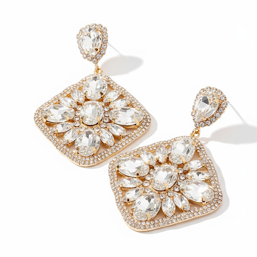 Oval Marquise Stone Cluster Accented Rhinestone Rhombus Dangle Evening Earrings