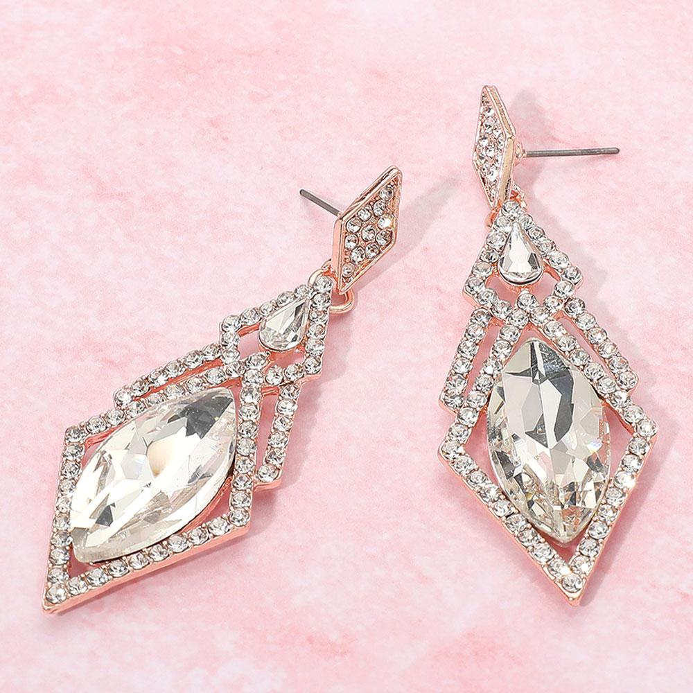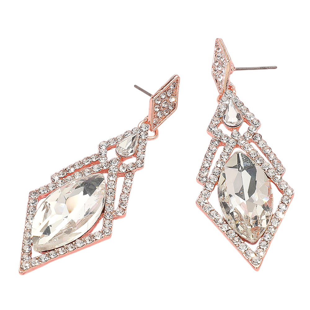 • Elegant statement earrings with a modern geometric design and sparkling crystals, ideal for weddings, parties, or glamorous evening events.