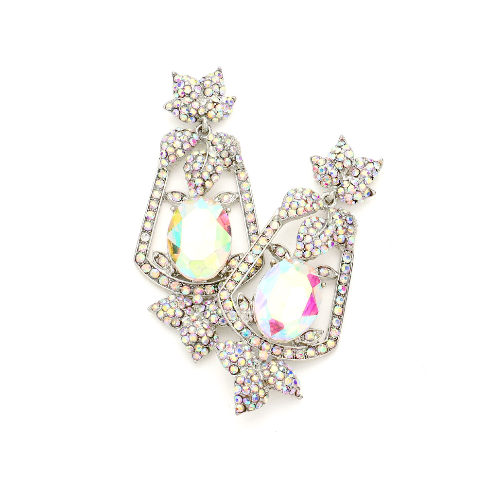 Oval Stone Accented Rhinestone Leaf Evening Dangle Earrings