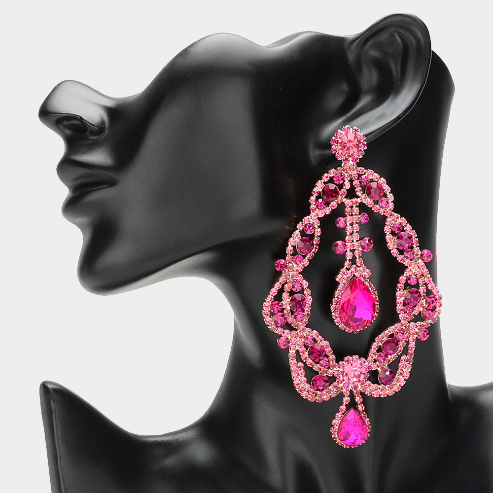 Oval Stone Cluster Pointed Rhinestone Paved Chandelier Evening Earrings