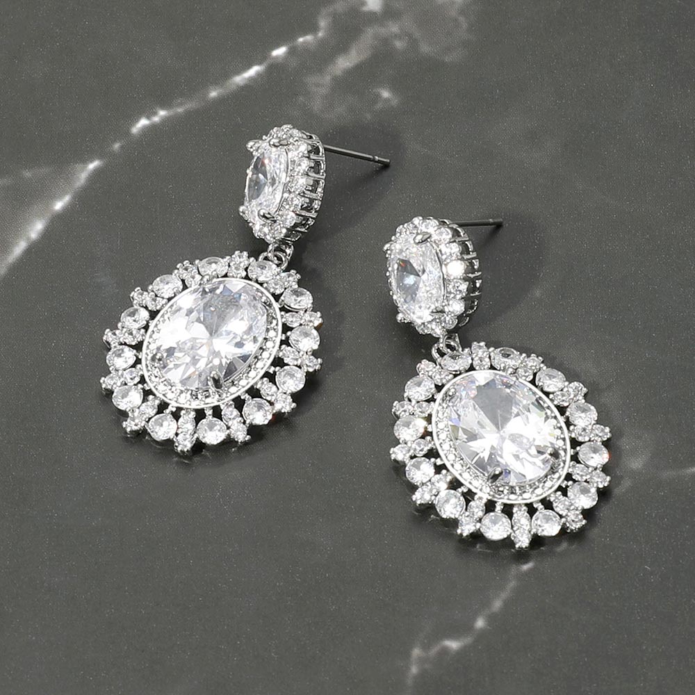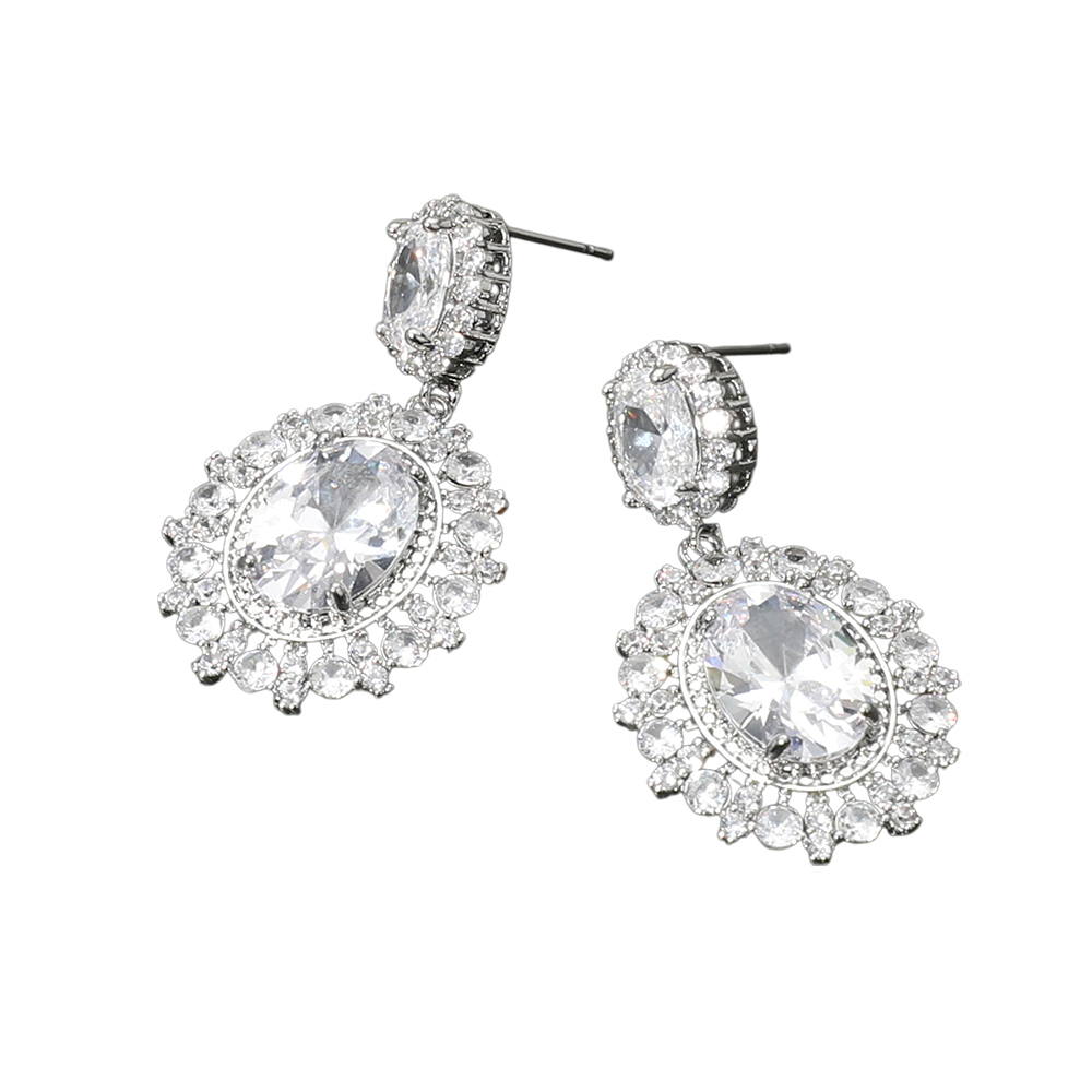 Details • Size : 0.8" X 1.6" • Post Back • These glamorous drop earrings showcase oval-cut center stones surrounded by a radiant halo of shimmering accents. Designed to dazzle, they're perfect for adding refined sparkle to weddings, evening events, or elegant occasions. • Lead and Nickel Compliant • CZ Cubic Zirconia