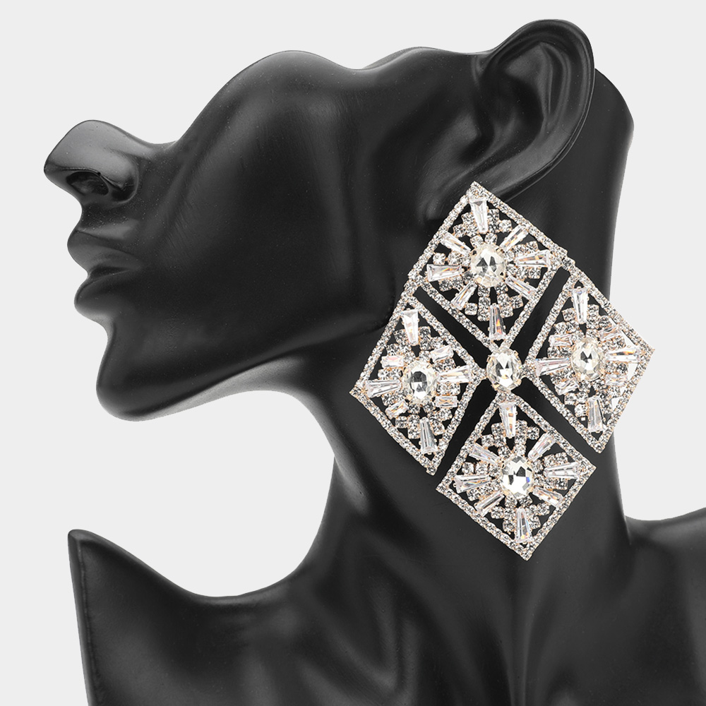 Oversized Glass Stone Embellished Diamond Frame Chandelier Evening Earrings