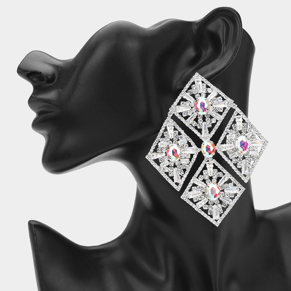 Oversized Glass Stone Embellished Diamond Frame Chandelier Evening Earrings