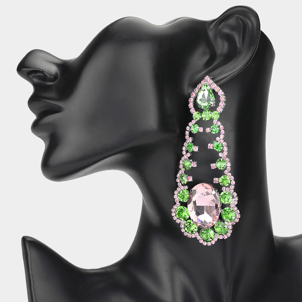 Oversized Oval Teardrop Stone Cluster Accented Rhinestone Chandelier Evening Earrings