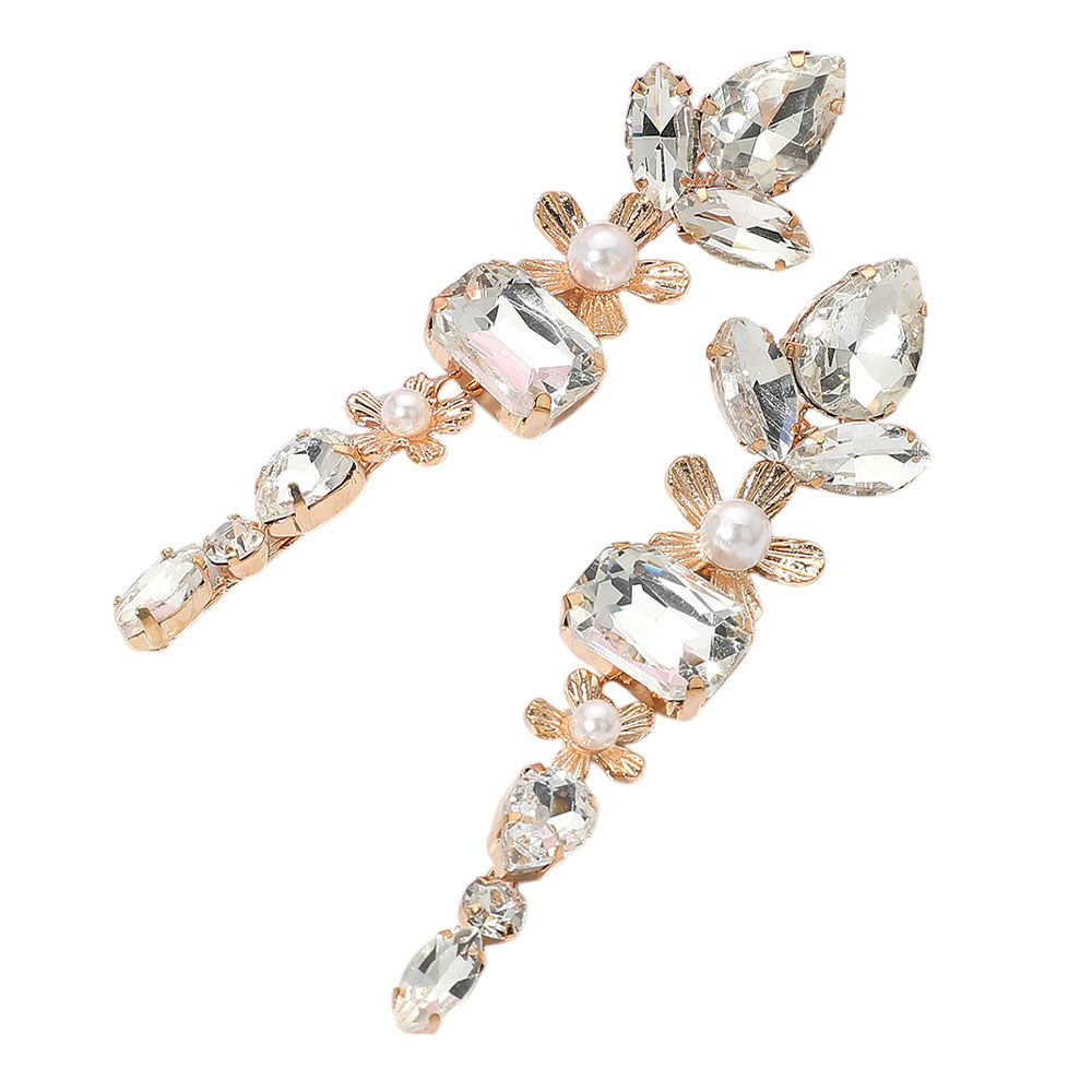 Details • Size : 0.8" X 3.25" • Post Back • Sophisticated drop earrings adorned with faceted crystals and pearl accents in a floral motif. Perfect for weddings, proms, or black-tie events, these earrings offer timeless elegance and sparkling charm. • Lead and Nickel Compliant