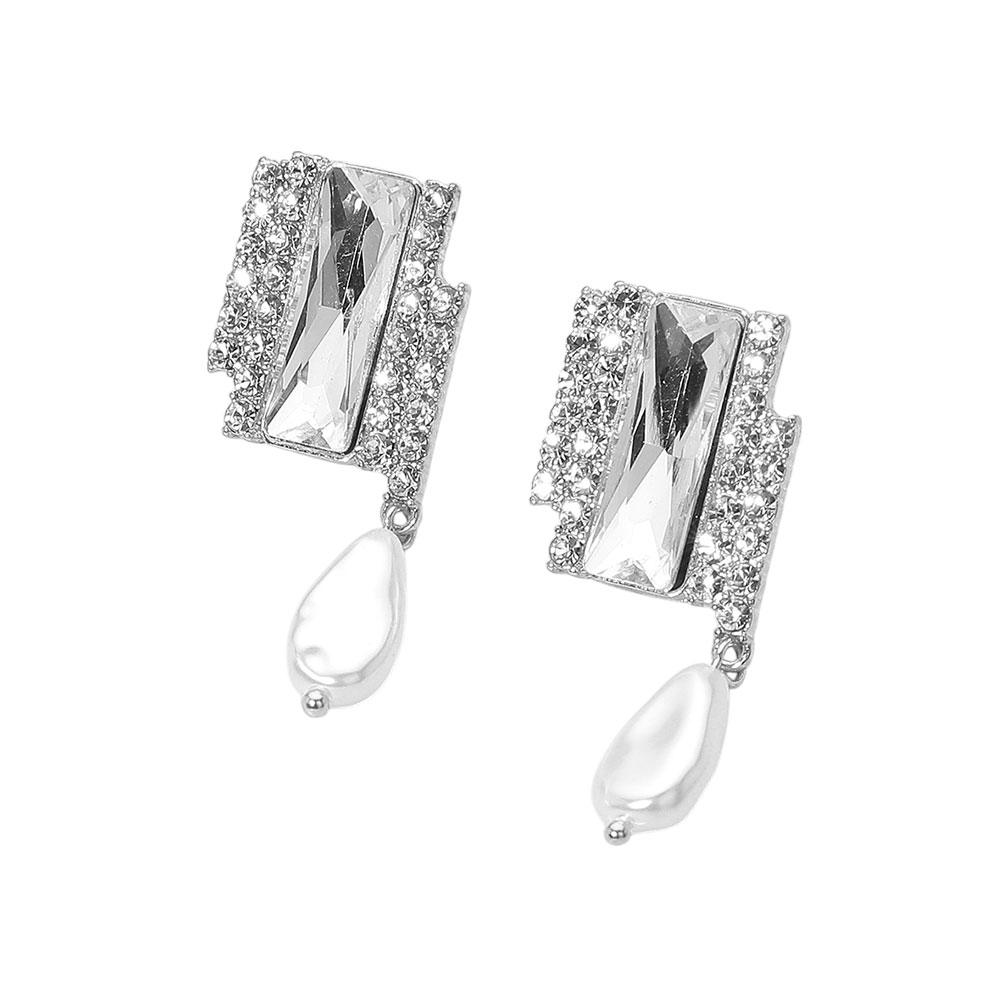 Details • Size : 0.75" X 1.8" • Post Back • Stylish earrings featuring a rectangular crystal frame and a dangling pearl accent. Perfect for adding glamour to any outfit, from eveningwear to casual elegance. • Lead and Nickel Compliant
