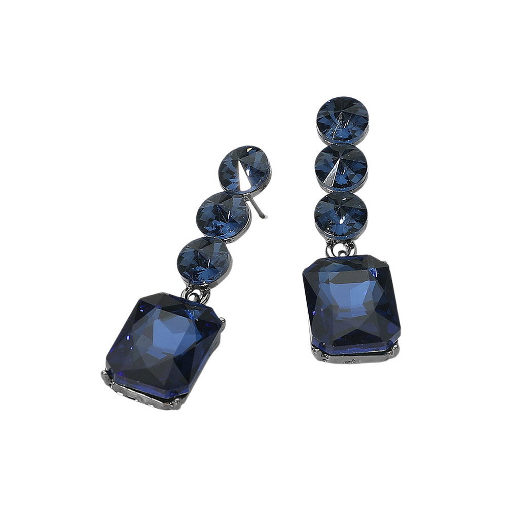 • These geometric crystal drop earrings feature round and rectangular faceted stones in a sleek cascading design. Perfect for adding modern elegance to evening wear, parties, or special occasions, they combine bold sparkle with sophisticated style.