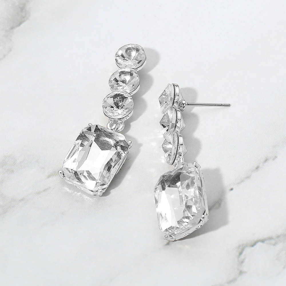 • These geometric crystal drop earrings feature round and rectangular faceted stones in a sleek cascading design. Perfect for adding modern elegance to evening wear, parties, or special occasions, they combine bold sparkle with sophisticated style.