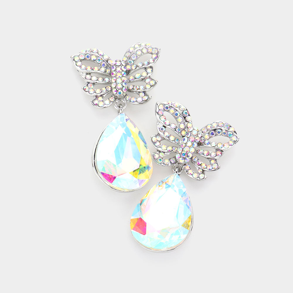 Rhinestone Embellished Butterfly Teardrop Stone Link Dangle Evening Earrings