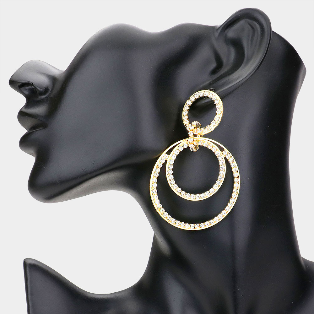 Rhinestone Pave Double Open Circle Dangle Evening Earrings