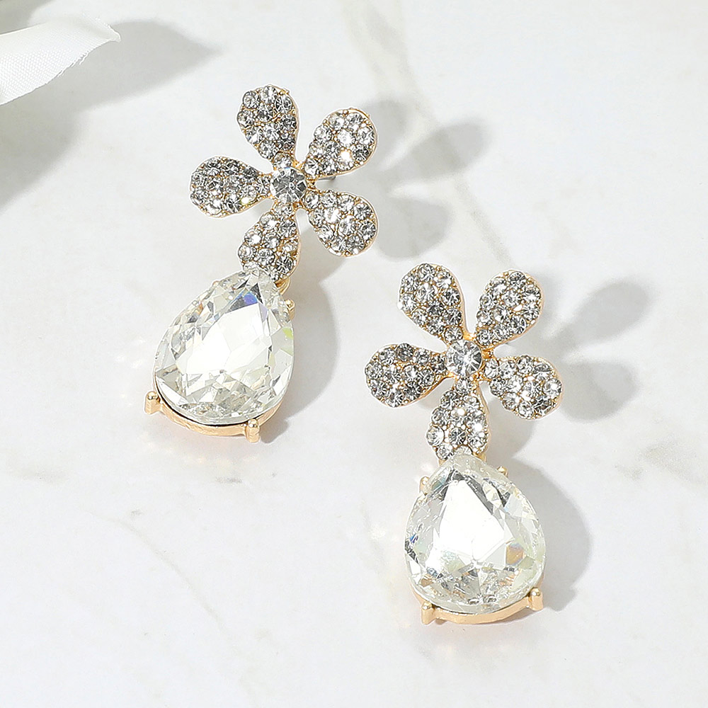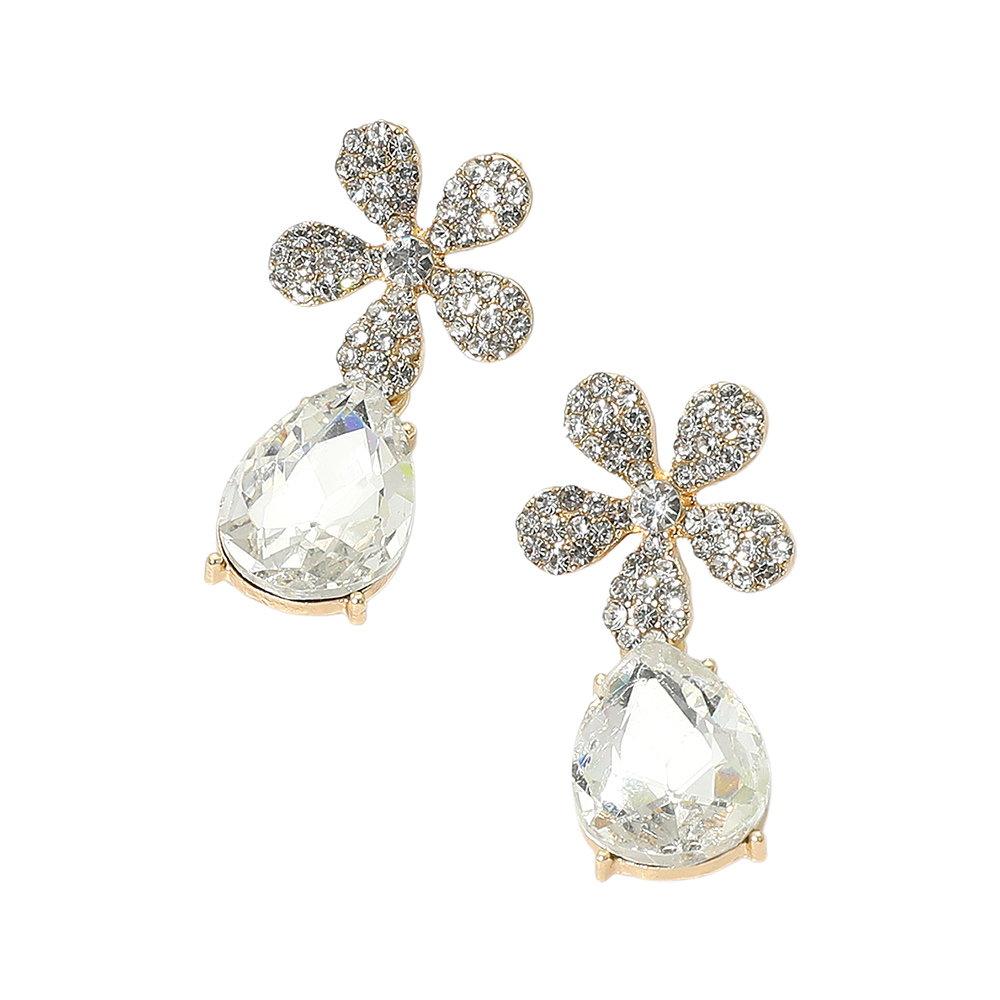 Details • Size : 0.75" X 1.5" • Post Back • Charming floral drop earrings featuring glittering petal tops and teardrop-shaped crystal accents. A perfect blend of elegance and playfulness, ideal for adding sparkle to your outfit on any special occasion. • Lead and Nickel Compliant