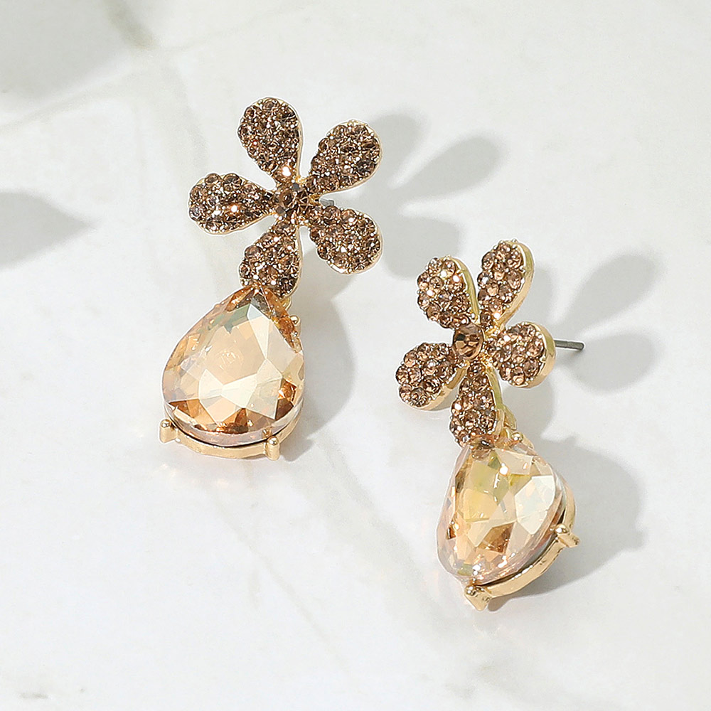 Details • Size : 0.75" X 1.5" • Post Back • Charming floral drop earrings featuring glittering petal tops and teardrop-shaped crystal accents. A perfect blend of elegance and playfulness, ideal for adding sparkle to your outfit on any special occasion. • Lead and Nickel Compliant