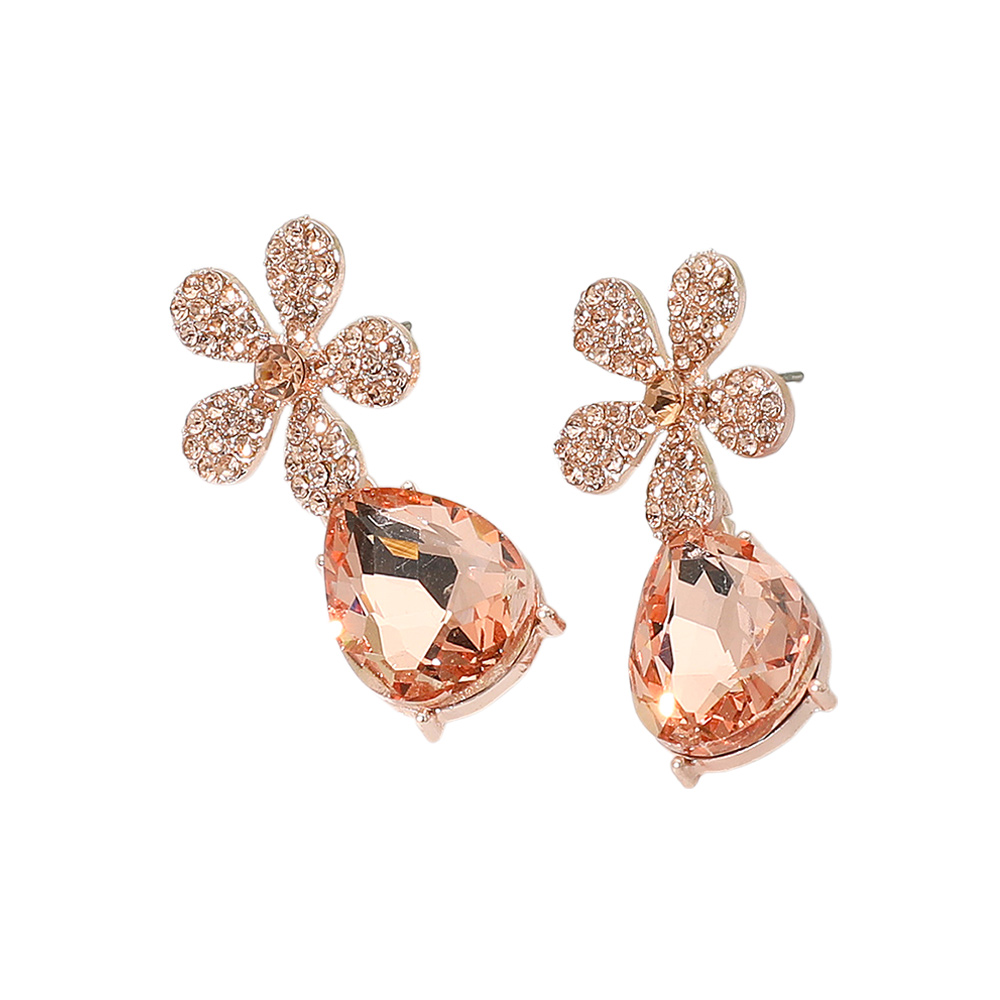 Rhinestone Paved Flower Accent Teardrop Dangle Evening Earrings