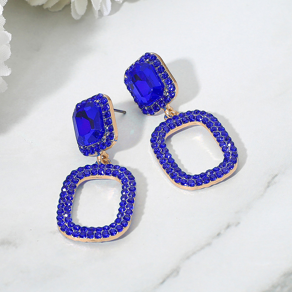 Details • Size : 0.75" X 1.6" • Post Back • Add a bold statement to your jewelry collection with these dazzling rectangular drop earrings. Featuring a sparkling gem top and shimmering accents on the open geometric frame, they combine glamour and elegance, perfect for elevating evening wear or enhancing everyday chic style. • Lead and Nickel Compliant