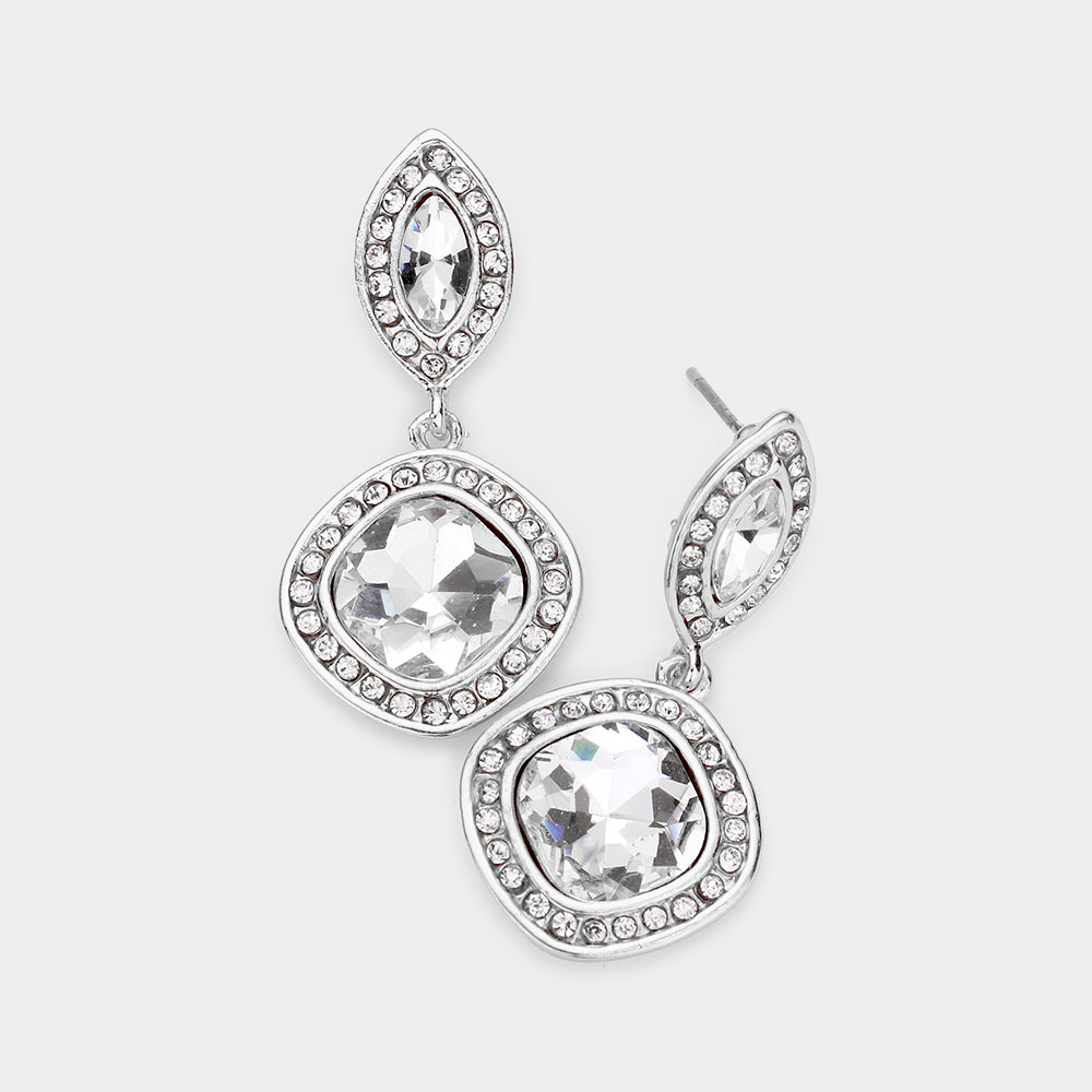 Rhinestone Trimmed Marquise Square Stone Link Dangle Evening Earrings