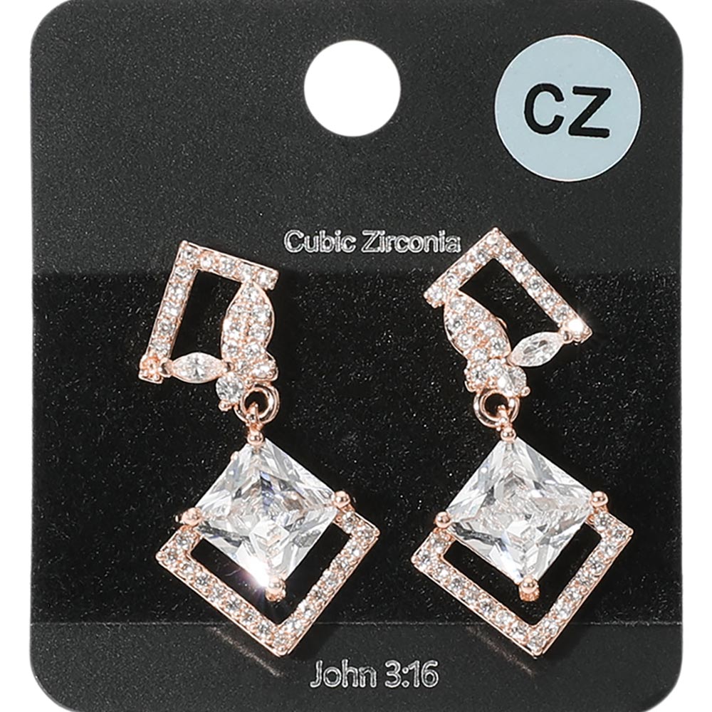 • These cubic zirconia geometric dangle earrings feature a striking square design with brilliant facets that capture the light beautifully. The modern yet elegant silhouette makes them ideal for special occasions or adding a touch of glamour to any outfit with refined sparkle.