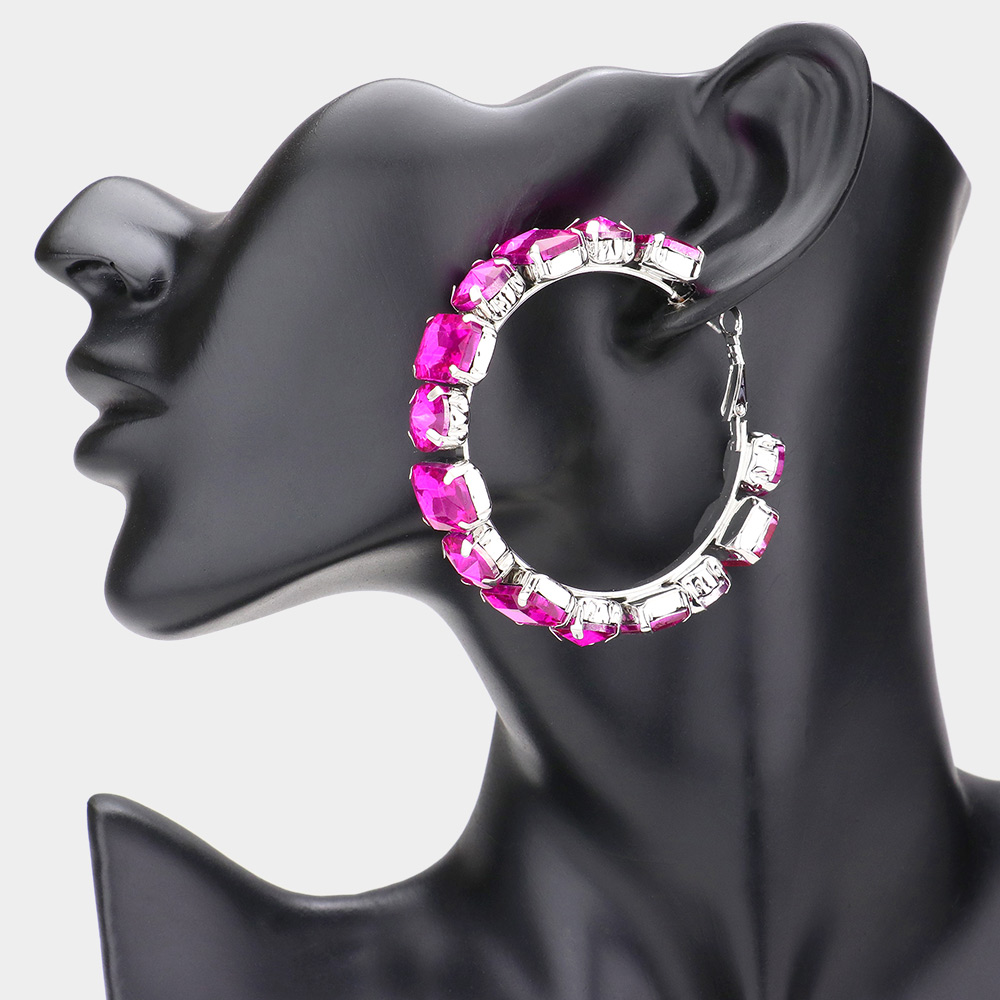 Round Emerald Cut Stone Cluster Hoop Evening Earrings