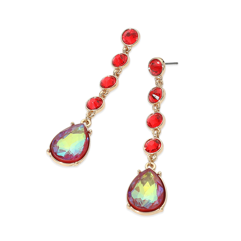 Details • Size : 0.5" X 2.7" • Post Back • Make a bold statement with these iridescent teardrop dangle earrings featuring gradient multicolor crystals and round accents in a sleek gold-tone setting. Lightweight and eye-catching, they’re perfect for evening events, parties, or adding a glam touch to your everyday style. A must-have accessory for trendsetters. • Lead and Nickel Compliant