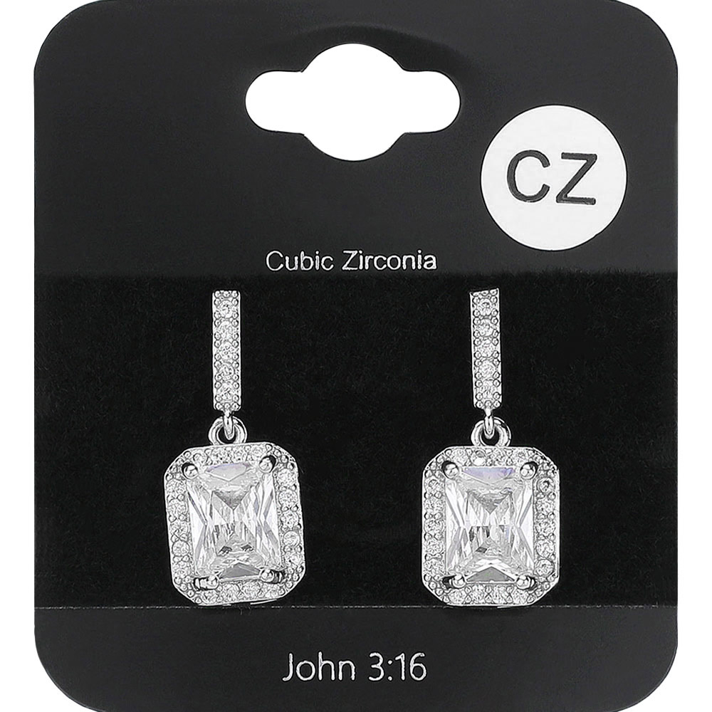 Details • Size : 0.4" X 0.9" • Post Back • Elegant drop earrings featuring rectangular-cut stones framed in a halo of smaller accents. A timeless accessory that adds brilliance and sophistication to any outfit. Perfect for formal occasions, weddings, or everyday sparkle with refined charm. • CZ Cubic Zirconia