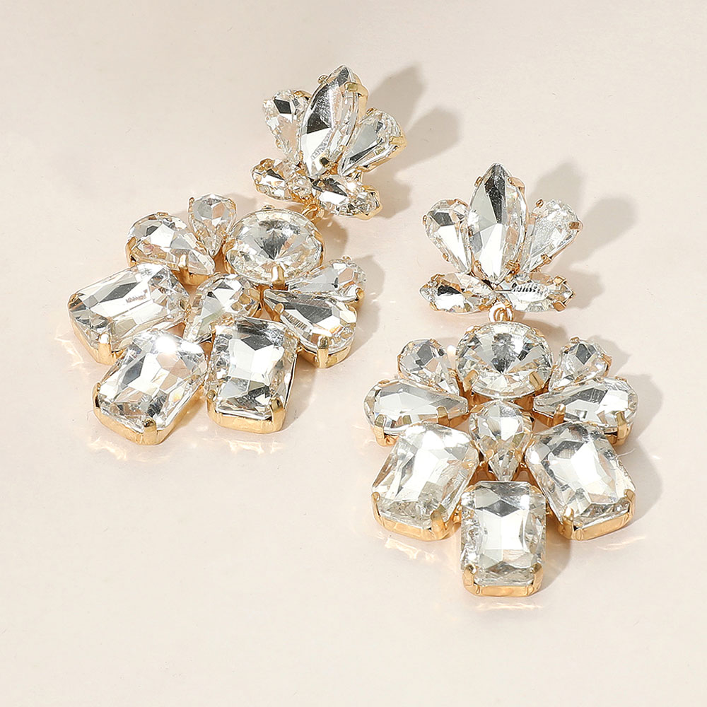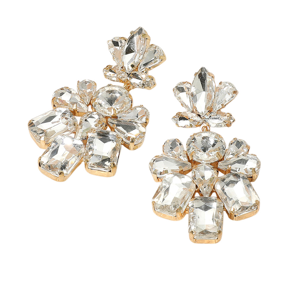 Details • Size : 1.3" X 2.5" • Post Back • Eye-catching statement drop earrings adorned with large faceted crystals for a dazzling effect. Perfect for adding elegance and sparkle to evening wear, weddings, or special occasions, making every outfit unforgettable. • Lead and Nickel Compliant