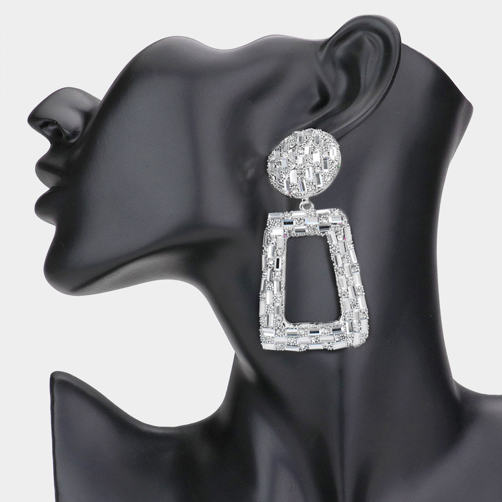 Stone Embellished Chunky Open Rectangle Dangle Evening Earrings