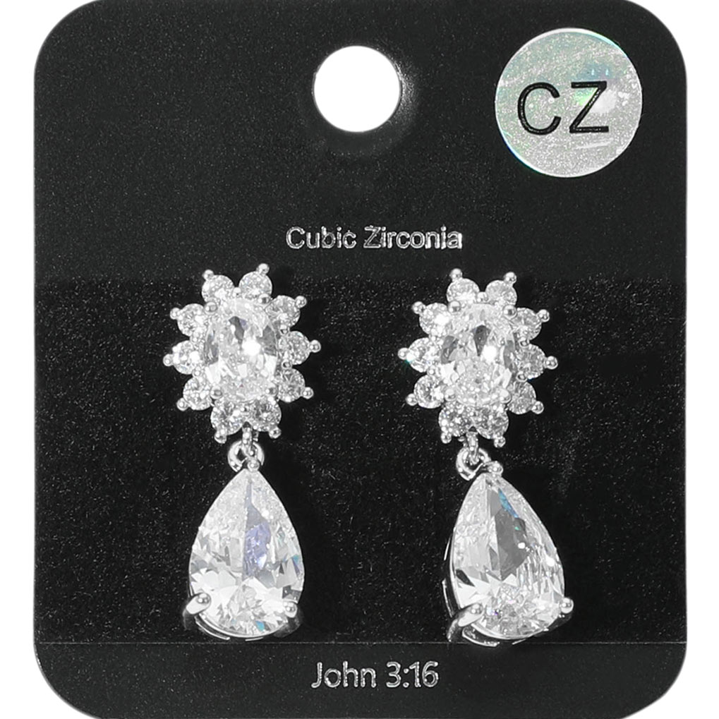 Details • Size : 0.4" X 1.1" • Post Back • These refined drop earrings feature brilliant cubic zirconia stones in a floral and teardrop design. Ideal for elevating formal looks or adding sparkle to evening outfits. A timeless accessory that blends sophistication with striking beauty. • Lead and Nickel Compliant • CZ Cubic Zirconia