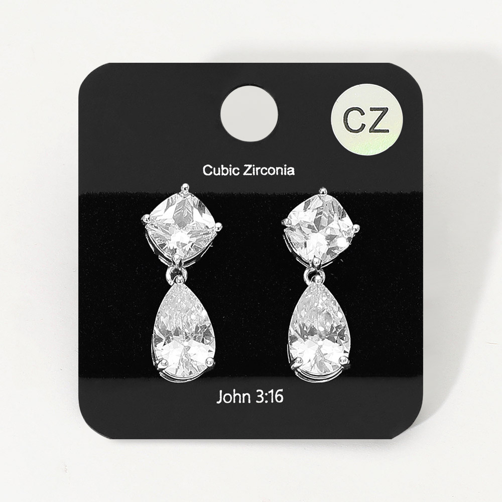 Details • Size : 0.4" X 1" • Post Back • These teardrop cubic zirconia drop earrings showcase dazzling brilliance with a radiant dual-stone design. The shimmering teardrop crystals catch the light beautifully, creating an elegant statement piece perfect for weddings, evening events, or adding sparkle to any outfit. • CZ Cubic Zirconia • Lead and Nickel Compliant