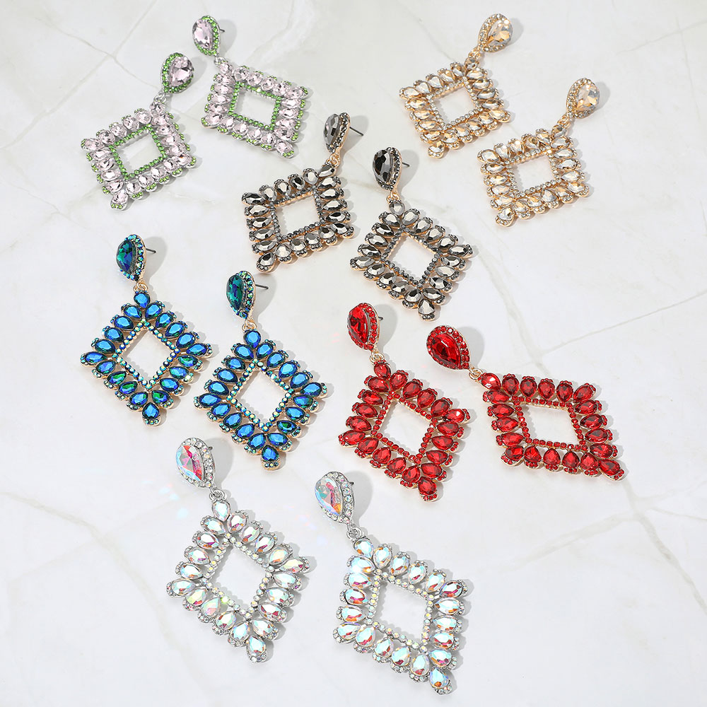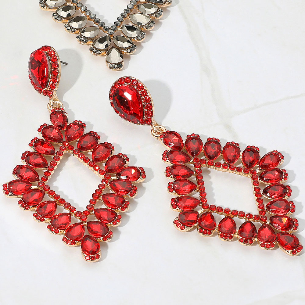 Teardrop Glass Stone Cluster Trip Open Rhombus Dangle Evening Earrings