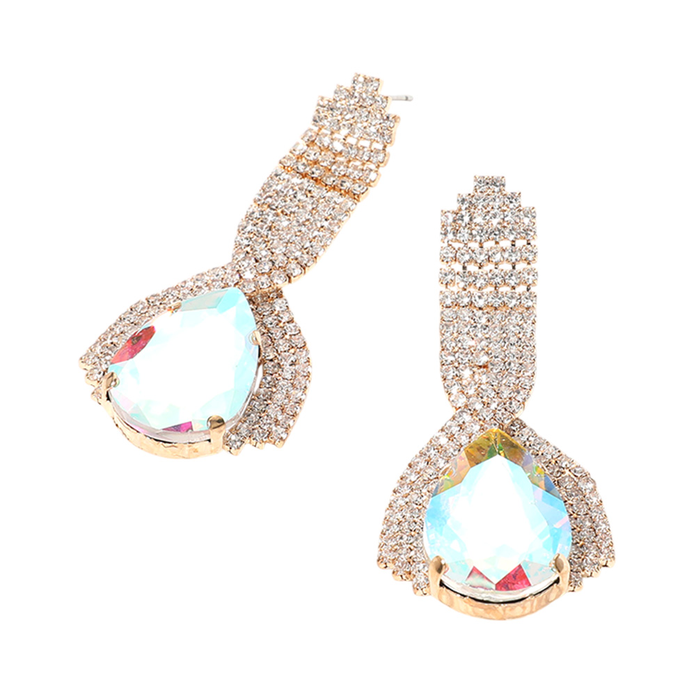 Teardrop Glass Stone Pointed Rhinestone Paved Evening Earrings
