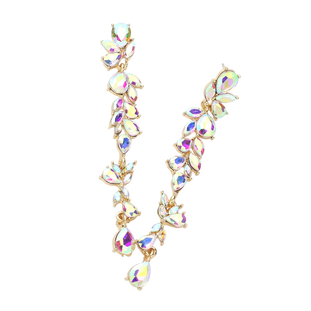 • These iridescent leaf drop earrings feature a cascading design of marquise and teardrop crystals that shimmer beautifully from every angle. Lightweight yet eye-catching, they bring a luminous touch to any outfit, making them ideal for special occasions or elegant evening wear.