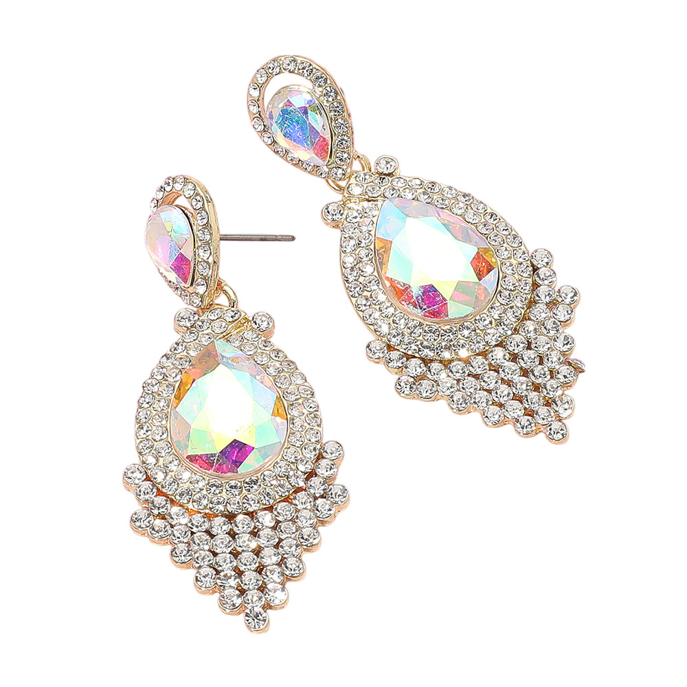 • Elegant teardrop dangle earrings with sparkling crystal embellishments and layered fringe design, ideal for weddings, parties, or glamorous evening events.