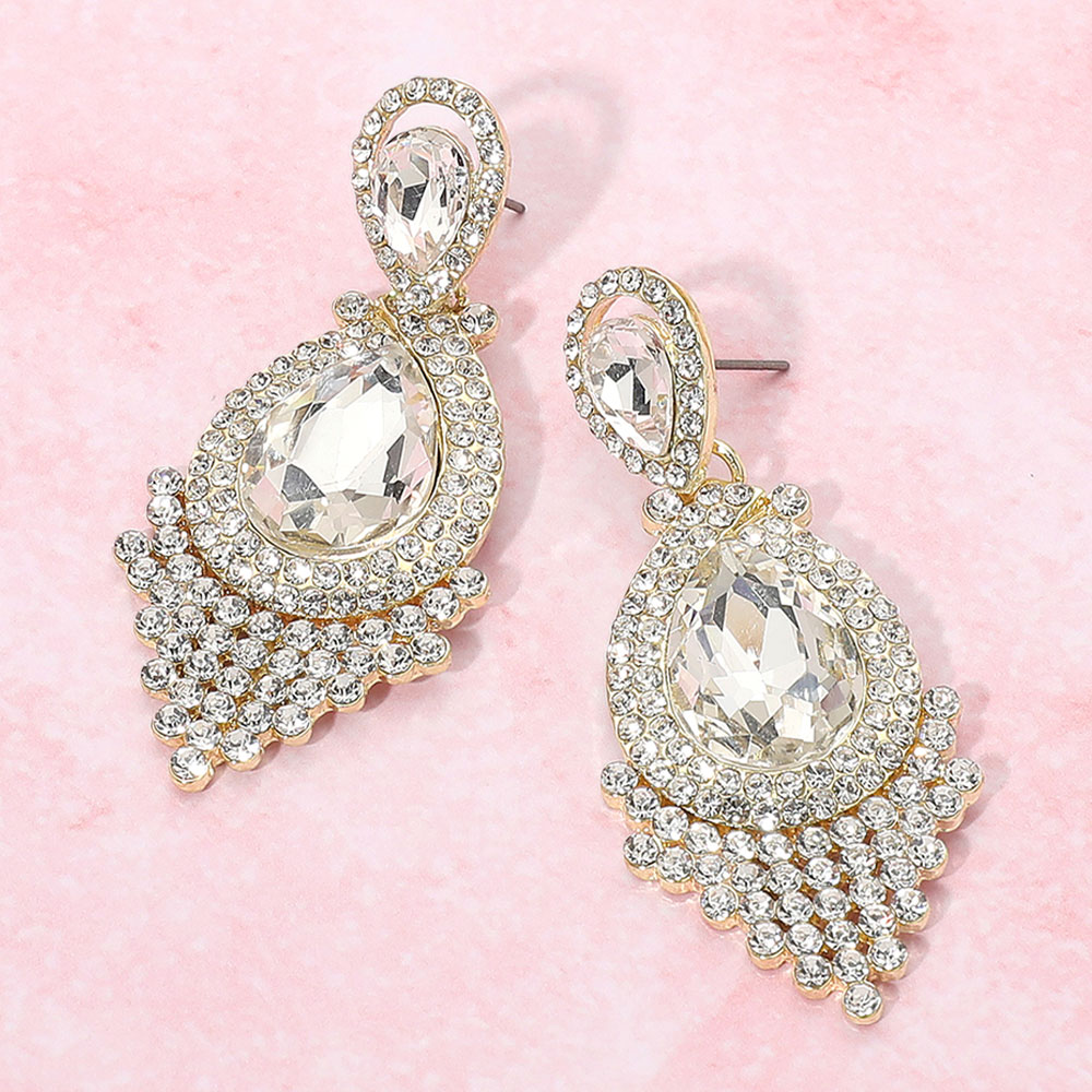 • Elegant teardrop dangle earrings with sparkling crystal embellishments and layered fringe design, ideal for weddings, parties, or glamorous evening events.